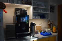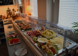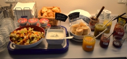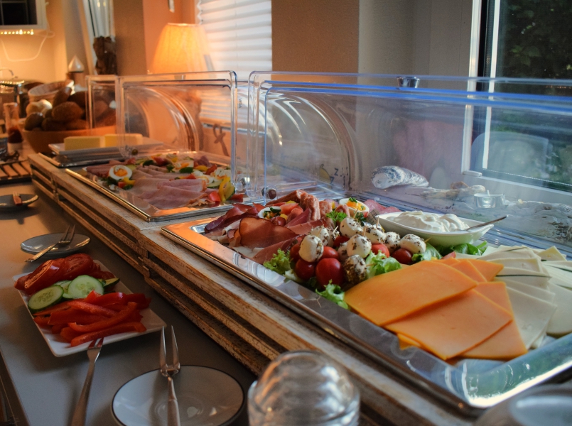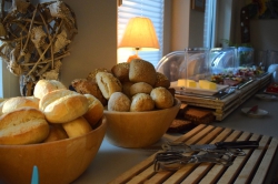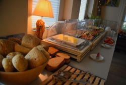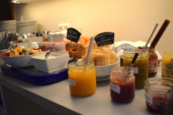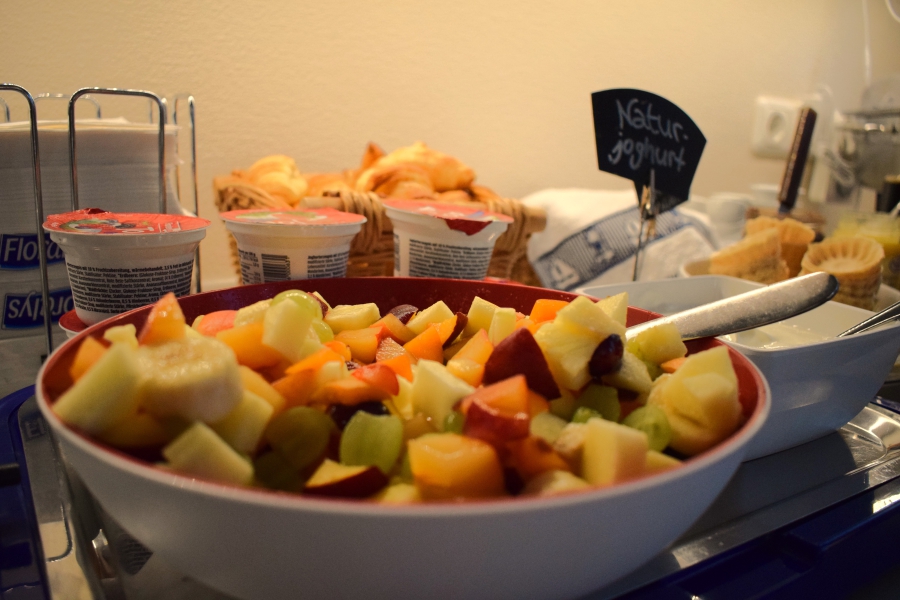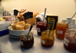 Beim reichlichen Frühstücksbuffet in unserem Hotel ist für jeden etwas dabei. Wurst, Käse, etwas Süßes, selbstgemachte Marmeladen, frischgeschnittener Obstsalat und natürlich frisch gebackene Brötchen und verschiedene Brotsorten, sowie Kaffeespezialitäten oder Tee. Guten Appetit!